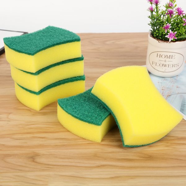 Product parameter Size: 10x7x3cm Material: sponge, scouring pad Color: Yellow + Green Features Double-sided dishwashing is more efficient. High-density sponge, good water absorption, non-oily, easy to make rich foam. It is soft and elastic and does not damage the surface of the appliance.